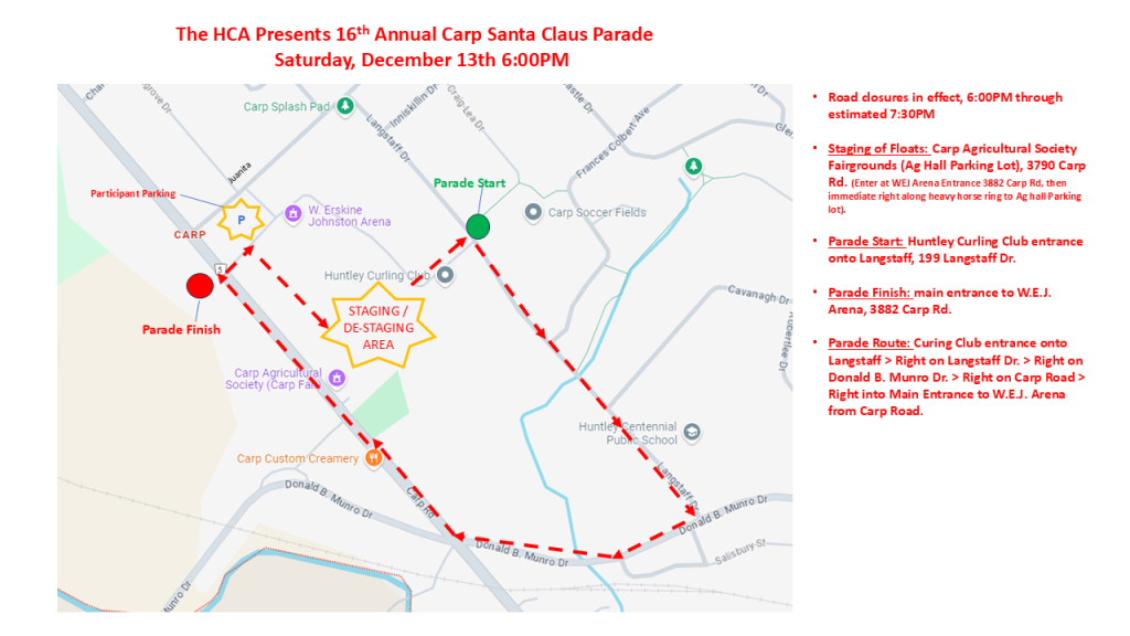 - The Huntley Community Association is thrilled to present the 16th Annual Santa Claus Parade on December 13th, supporting the West Carleton Food Access Centre. Donations will be collected on the route (non-perishables and/or cash).